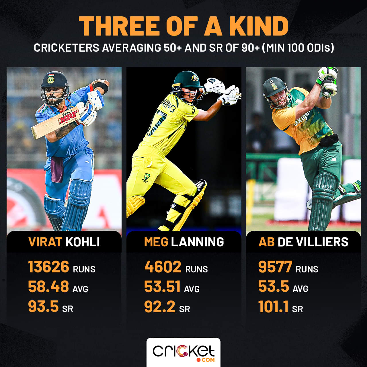 Only two cricketers in men’s cricket have averaged over 50 and struck at 90+ strike-rate (min 100 ODIs): AB de Villiers and Virat Kohli. It is already a rare feat in the sport, but when you look at it from a women’s cricket lens, there is only one: Meg Lanning.