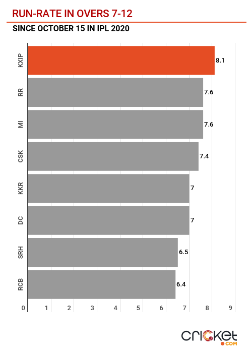 Consequently, KXIP have the highest run-rate in what is considered to be the slowest batting phase in a T20 innings - overs seven to 12.