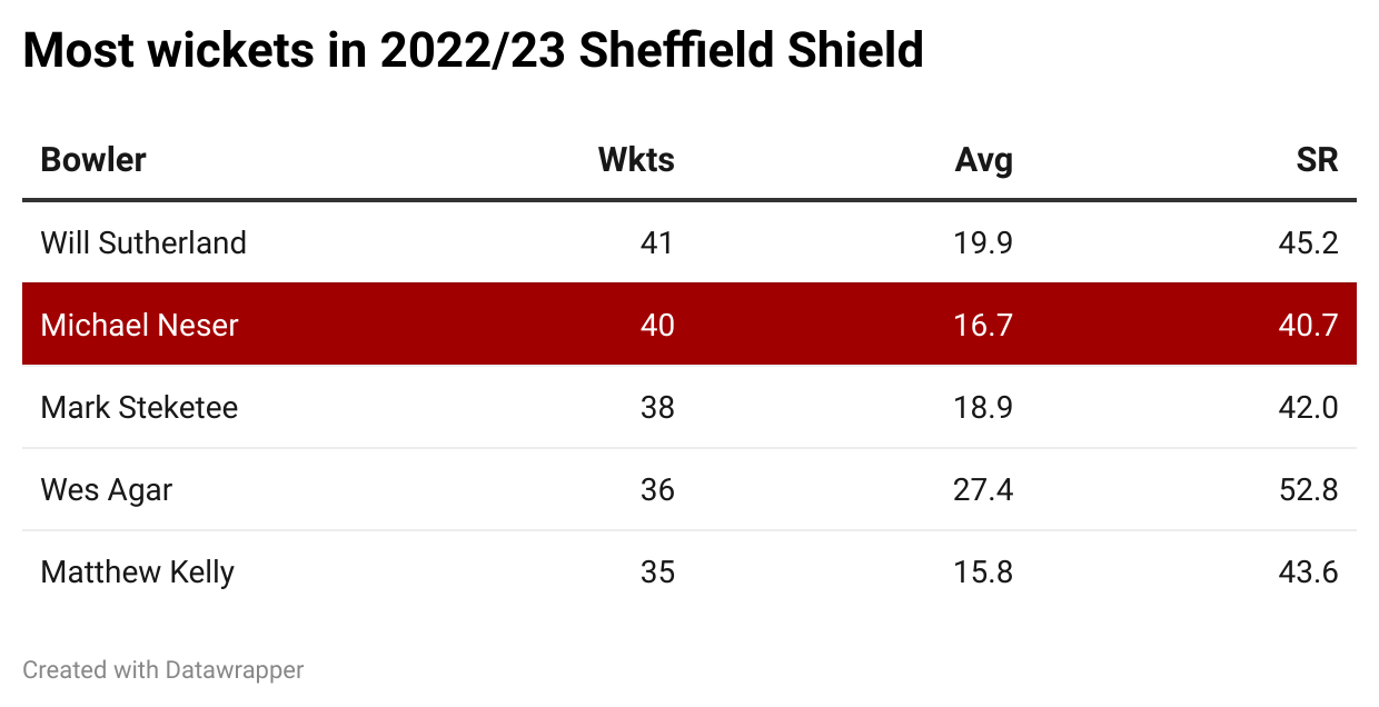 In the 2022/23 Shield season back home in Australia, where the wickets are flat and the Dukes is not used anymore, Neser finished as the second-highest wicket-taker, taking 40 wickets in 15 innings at a scarcely believable average of 16.7.