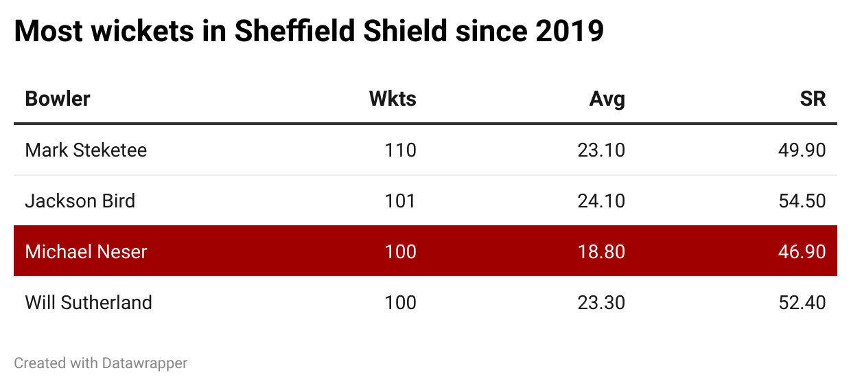 He’s been at it for a while now. In the last four years, Neser is one of four bowlers to have taken 100 or more Shield wickets. Among the four, however, he is the only one to have taken the wickets at an average less than 20. Absolute champion stuff.