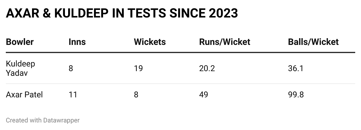 On bowling capabilities alone, Axar is no match to Kuldeep. After a terrific start to his Test career, Axar’s bowling has tapered off. He has managed only eight wickets in six Tests since 2023. Kuldeep, meanwhile, playing only four Tests in this time period, all against England this year, has 19 scalps. He snapped key wickets in a competitive series against the Three Lions, raising his stocks in the red-ball format.