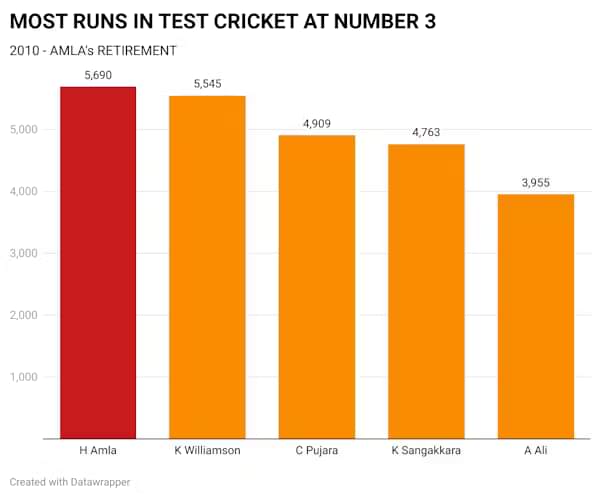 Despite the unforeseen dip in his numbers at the halfway stage in the decade, the veteran remains the highest run-scorer for a number three batsman since 2010. 2000s had Rahul Dravid, Ricky Ponting and Kumar Sangakkara. This decade has had Amla, followed by Kane Williamson and Cheteshwar Pujara.