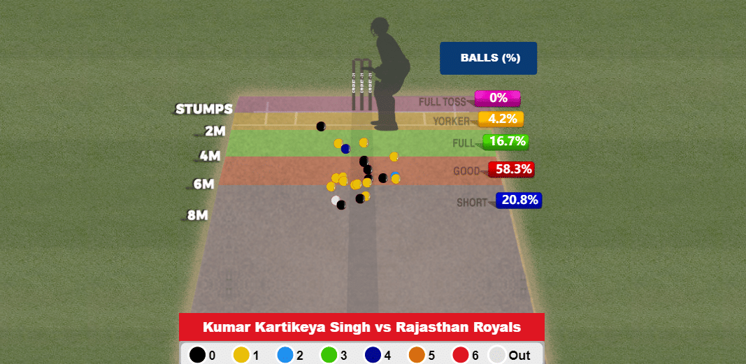 A detailed analysis of the pitch map helps us understand that Kartikeya bowled 58.3 percent of his deliveries on the good length area and within the stumps, causing great difficulty for the batters to score freely.