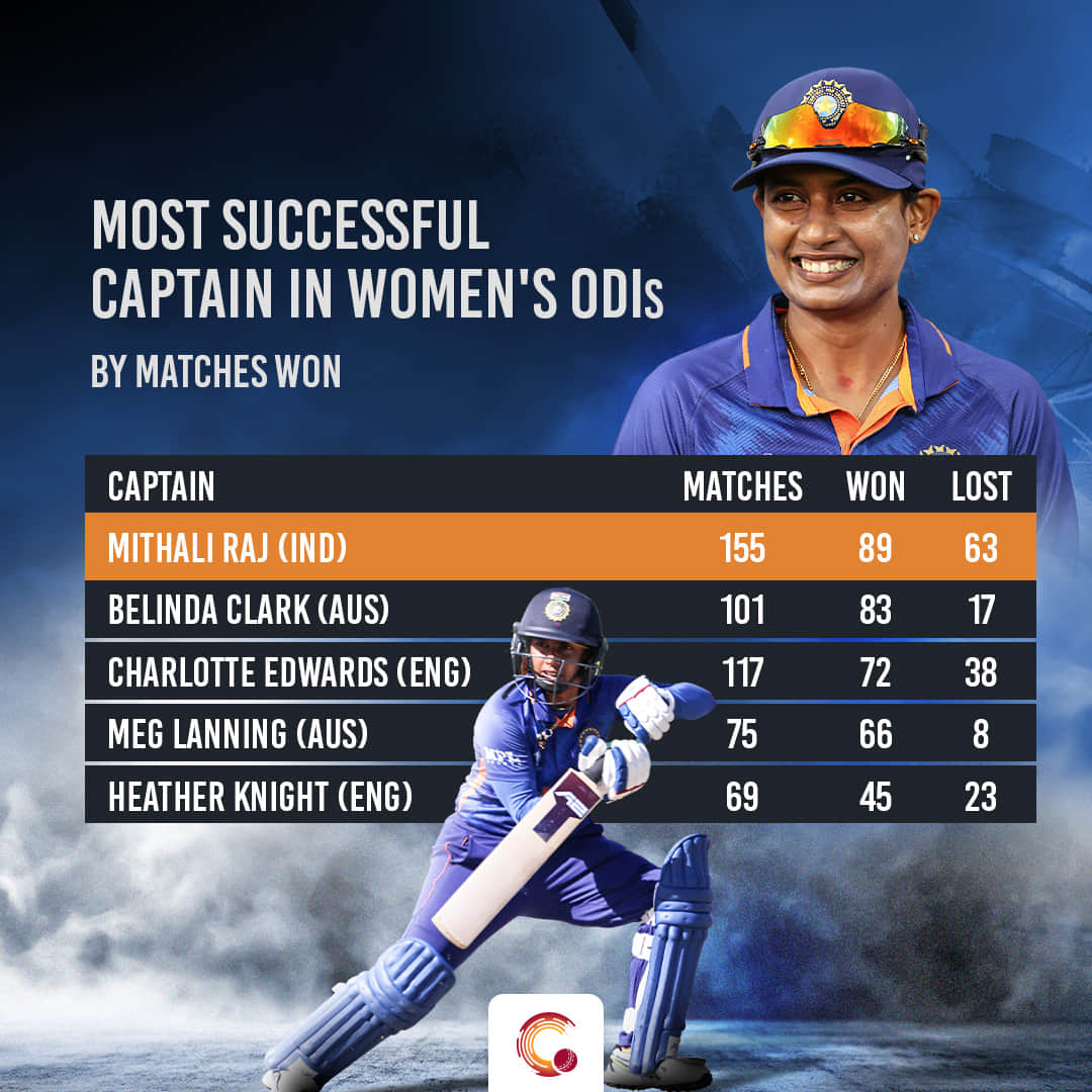 Since then, Raj captained India in 155 ODIs, which is the most by any player in W-ODIs. No other captain till date has led their team in more than 120 matches. In these 155 matches, India won 89 and lost 63 with three no results. In W-ODIs, her 89 wins are the most for a captain and her 63 losses are also the most.
