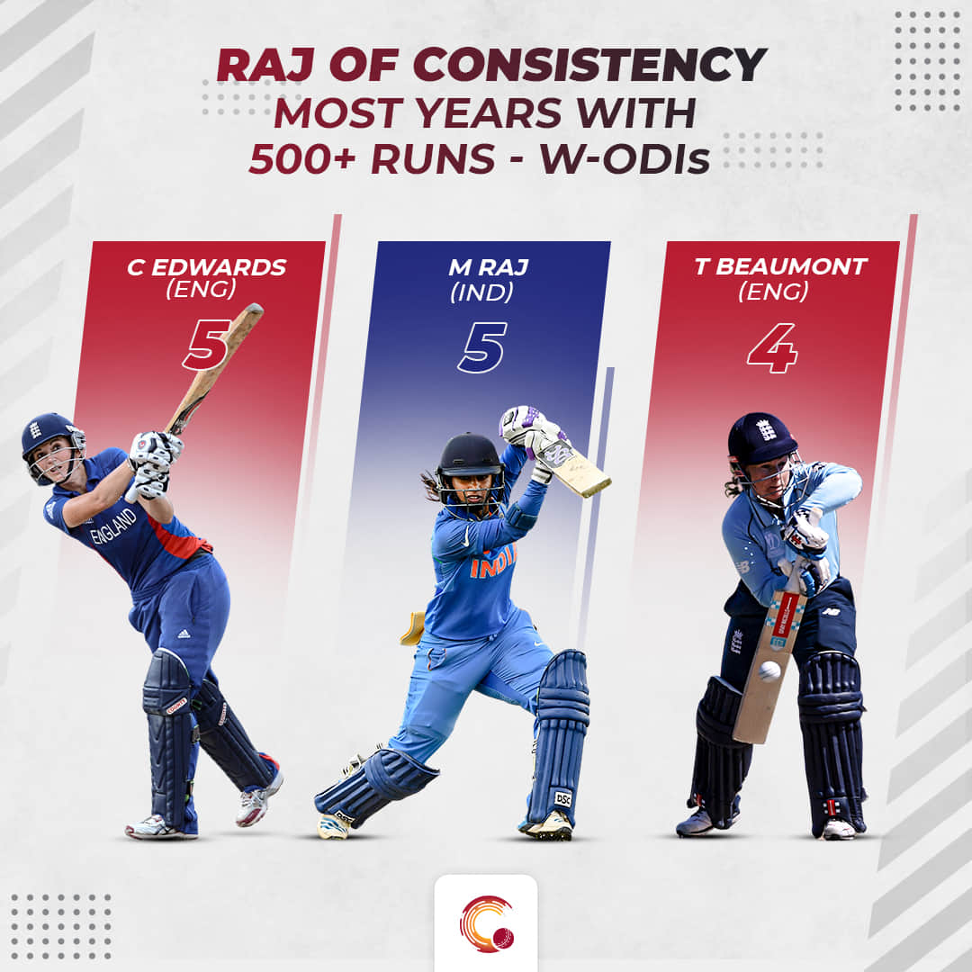In W-ODIs, she is levelled with Edwards, who also has hit 500 runs in a year across five years. Edwards in 1997, 2000, 2004, 2005 & 2013 scored over 500 runs. Mithali achieved this feat in 2004, 2006, 2008, 2017 & 2021. Tammy Beaumont, who is third on the list, scored 500 runs across four years (2016, 2017, 2019 & 2021).
