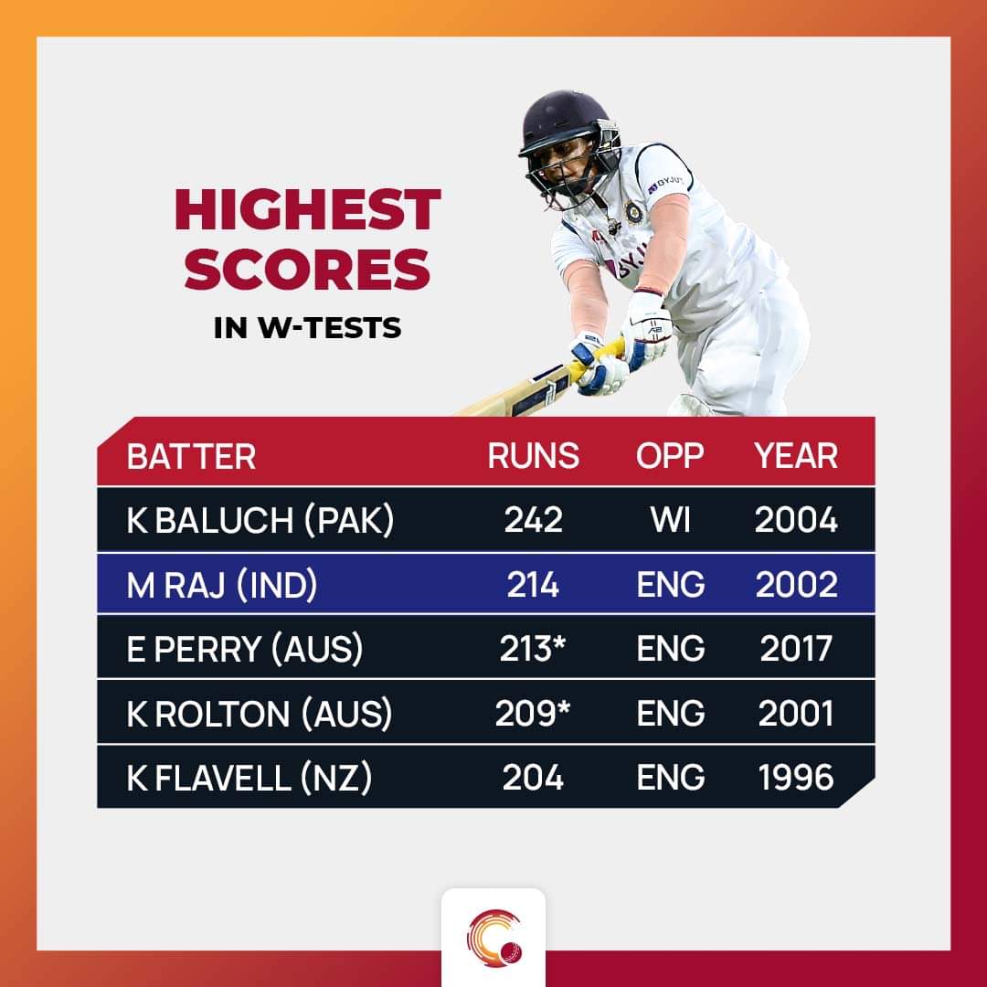 Against England in Taunton, Raj scored 214 while batting at number four. In W-Tests, only seven batters have scored a double century and Raj is one of them. To be precise, her score of 214, is still the second-best by a woman batter in Tests. To add more, she was 19 years and 254 days old at the start of the match when she scored a double. In Tests, among men or women, only Javed Miandad registered a double at a younger age (19 years and 140 days).