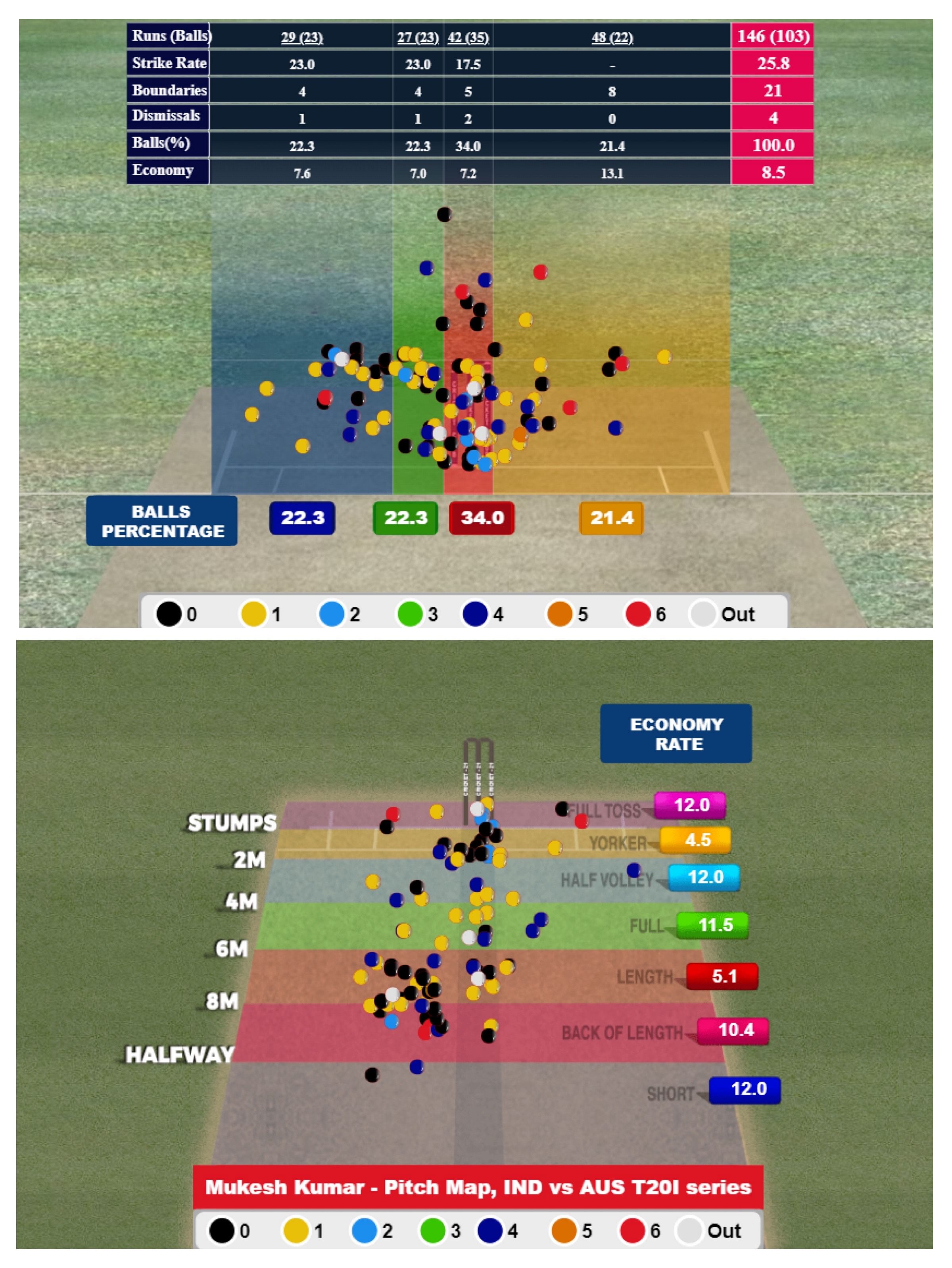 In the death, his yorkers are his biggest strength. Overall, 16.7% of all deliveries bowled by Mukesh Kumar in this series have just been yorkers, and on this length, he has given runs at only 4.5 per over, showing that not only is his Yorker frequently used, but it is hard to get away with as well. Additionally, a look at his beehive will also tell that 34% of all his balls have been hitting the stumps this series, which allows him to bowl tight lines and, when combined with the right length, become absolutely lethal with his skiddy pace.