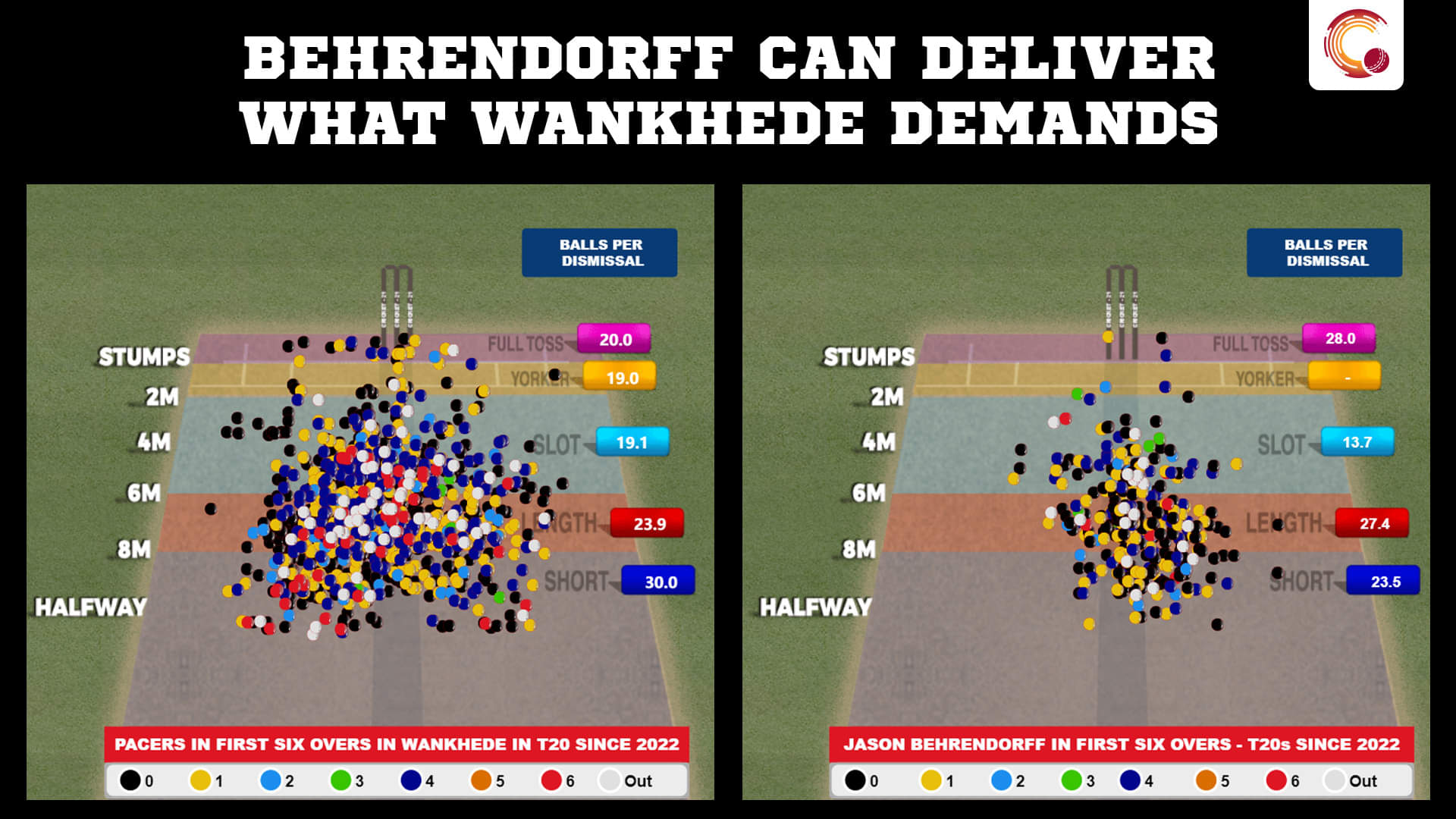 -In T20s since 2022, Jason Behrendorff's 41 % of wickets (16 of 39) have come when he has bowled it fuller. He has bagged a wicket every 11.4 balls from this length, his best across any. Wankhede could be the perfect venue for him. In the same period, pacers have a bowling strike rate of 17.5 when pitched full. Only when bowled short bowlers have a better strike rate (10.3).