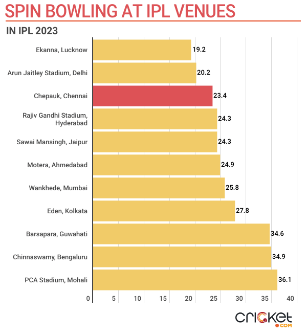 The MA Chidambaram Stadium is where the spinners are traditionally known to have a huge say and this season is no different. The spinners have struck once every 23.4 runs, 17.5 deliveries apart and have conceded 8 an over - numbers that are overwhelmingly better than the fast bowlers.