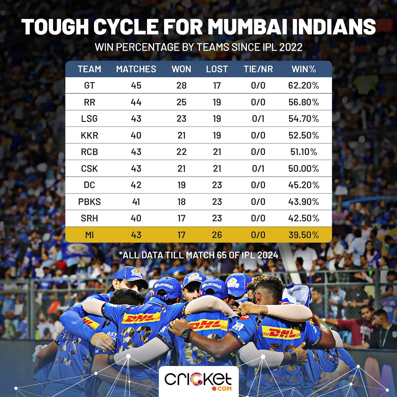 Three years later, the heyday of Mumbai Indians’ invincibility is behind them. On the contrary, no team has had a worse win percentage than them in the current cycle, which started with a mega auction in 2022. They have been the first team to be eliminated in two of the last three seasons.
