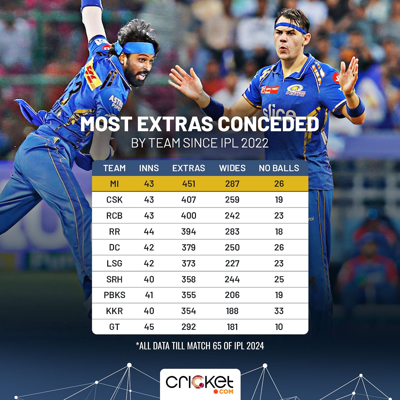 Spending 51.25 crore on effectively three players resulted in Mumbai having the lowest purse to invest in a bowling attack. This has reflected in the performance of their bowling unit as they have been the second-worst on economy and bowling average among all teams in the past three seasons. The inexperience of their bowling attack is evident since they have conceded the most number of extras: most wides (287) and the second-most no-balls (26).