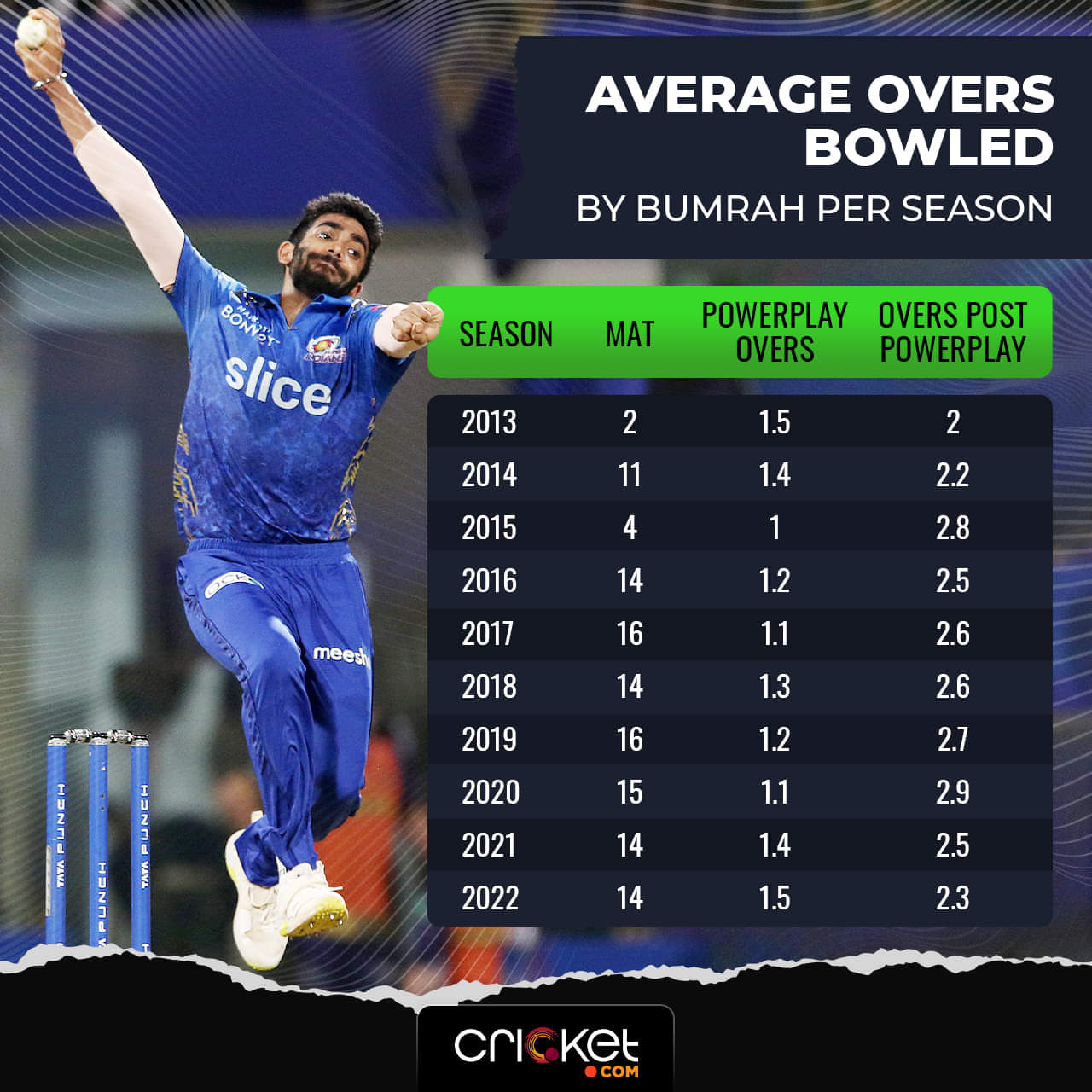 Only twice before 2022 did Bumrah’s average overs in the post-powerplay phase go below the 2.5 mark. Those seasons were