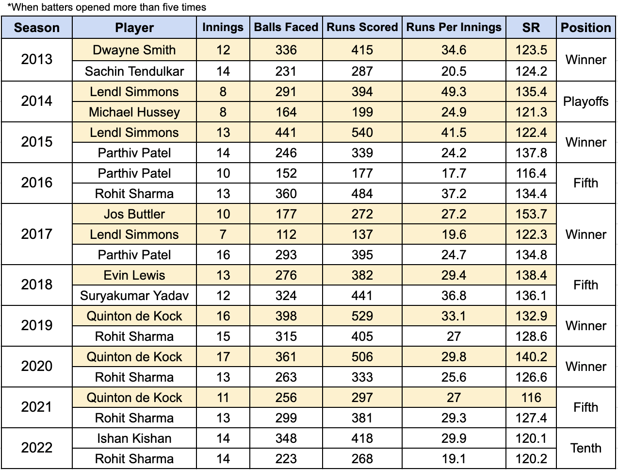 Rohit Sharma’s highest average from the 2017 IPL was 29.3, but that’s not spoken about much because of the team’s success. But whenever he plays more than 15 balls when opening (since 2019), he scores 42 runs per innings with a strike rate of 134.4.