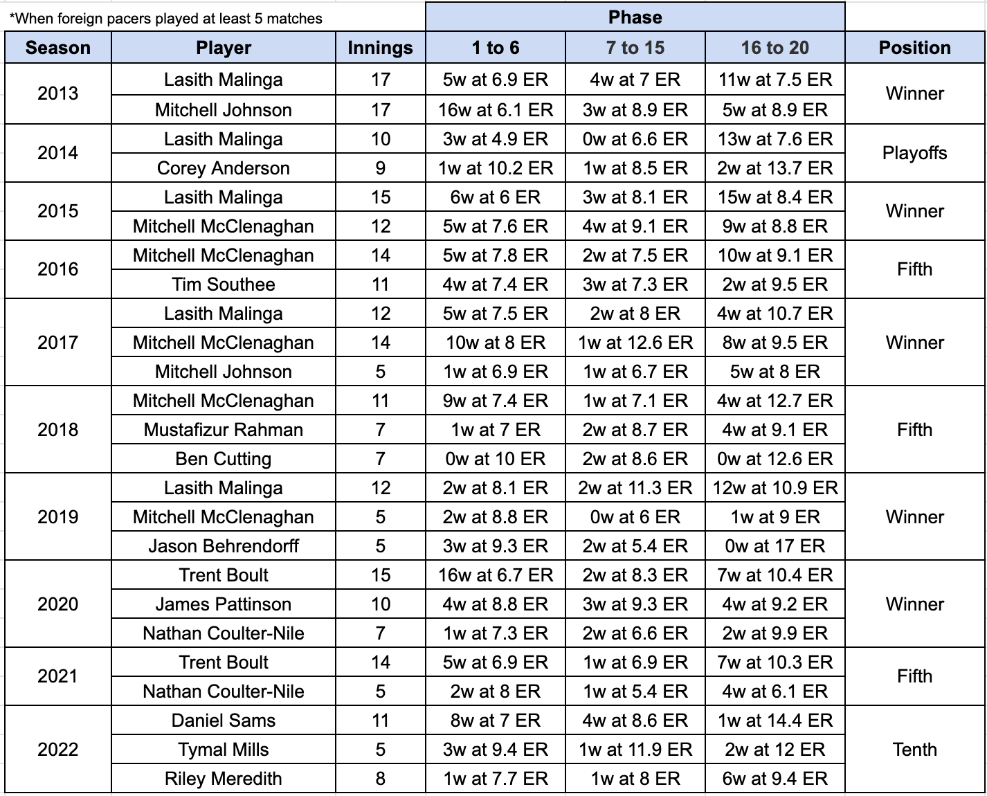 MI is one of the teams that have two foreign pacers who can strike up front for early breakthroughs and choke the opposition batters at death overs.