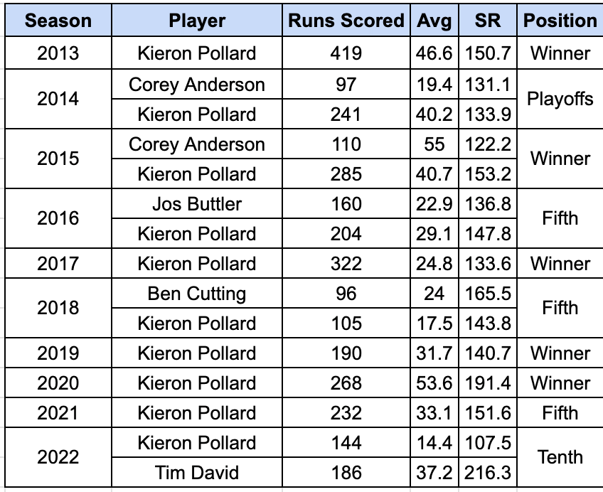 2022: Completely went away from their winning combination. Ishan Kishan and Rohit Sharma couldn’t provide a good start. Pollard had a poor season, and Tim David wasn’t given a long run at the start of the tournament. Tymal Mills, Riley Meredith, and Daniel Sams operated as the foreign pacers, and none of them had a track record of striking in the powerplay.