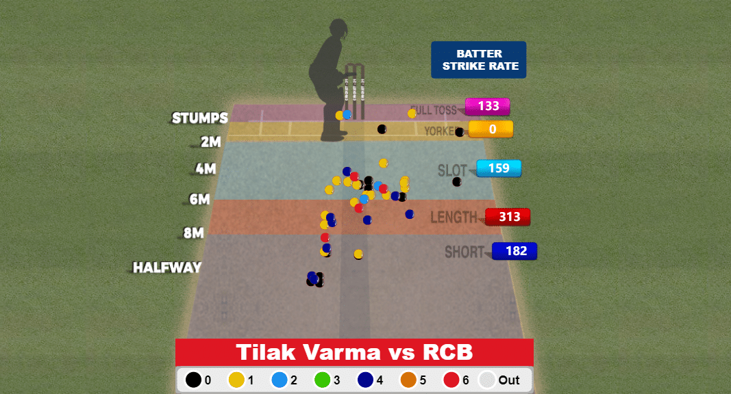Soon after, he lost the company of Suryakumar Yadav and the onus to rebuild the innings fell on him. And he couldn’t have done it any better. He kept hitting the fence frequently, and was consistent in rotating the strike. His Non Boundary Strike Rate of 72.7 is a reflection of that. The manner in which he dealt with every bowler was striking. He has no real weakness against particular lengths or spin type, and RCB learnt it the hard way.