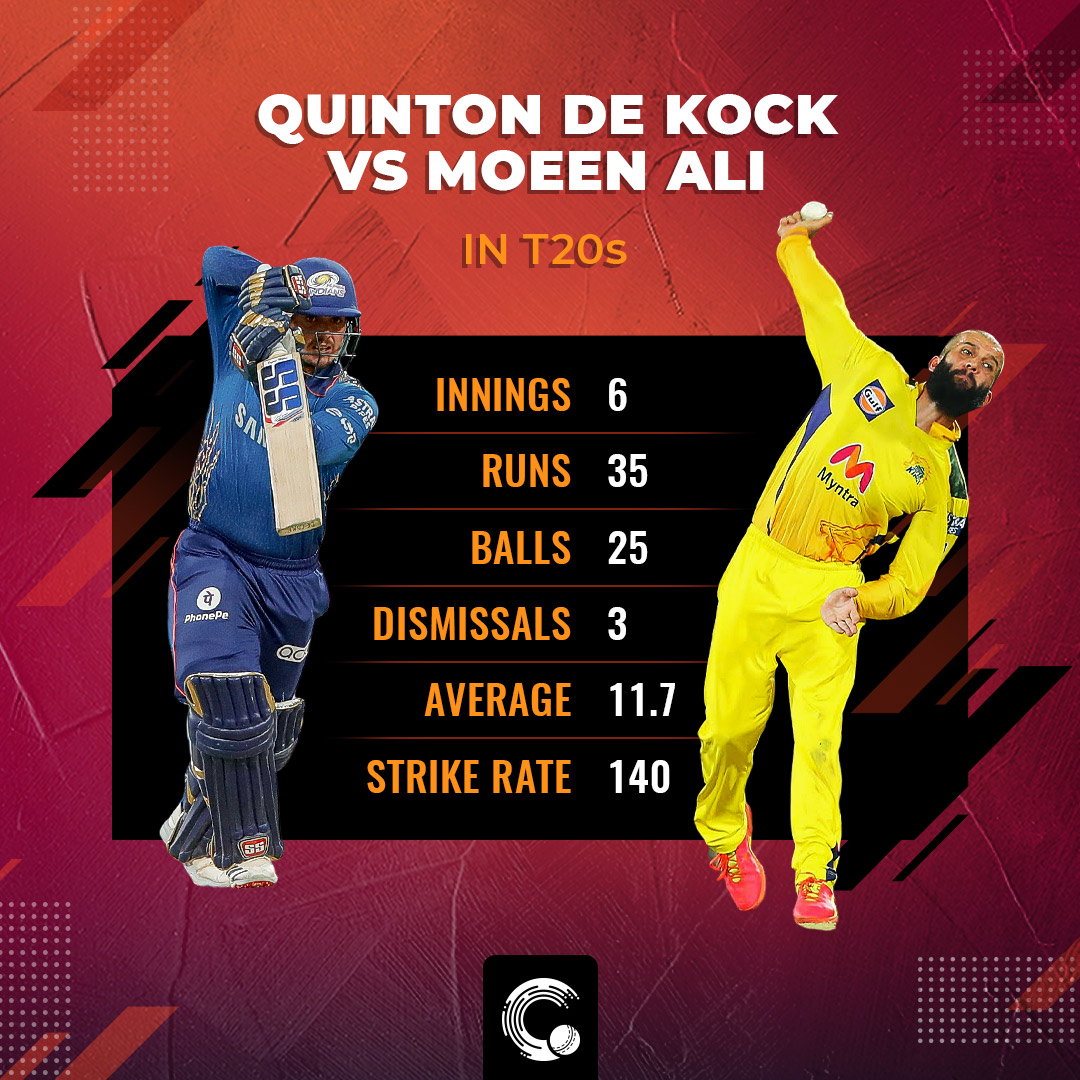 The match-up between Quinton de Kock and Moeen Ali could be an interesting one. Moeen has been doing the job for CSK with both bat and ball in the tournament so far and he will be up against South Africa ‘keeper, who roared back to form in the previous match with an unbeaten 70. The off-spinner has dismissed the southpaw thrice in T20s in six innings. Moreover, de Kock has managed to score just 35 off 25 at an average of 11.7 against Moeen in the shortest format. It will be interesting to see if Moeen is introduced early in the powerplay to deal with de Kock.