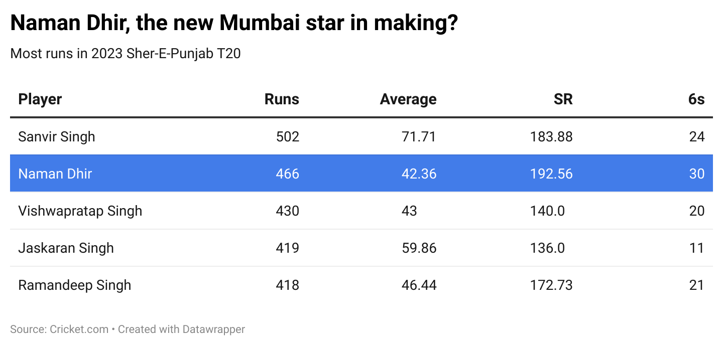 Largely, his talent wasn’t well-known in the league. But that’s where Mumbai’s scouting system goes deep into the cricketing systems in the country, having scouted the all-rounder at the 2023 Sher-E-Punjab T20 tournament. In that tournament, Dhir was the second-highest run-scorer, with 466 runs, averaging 42.36.