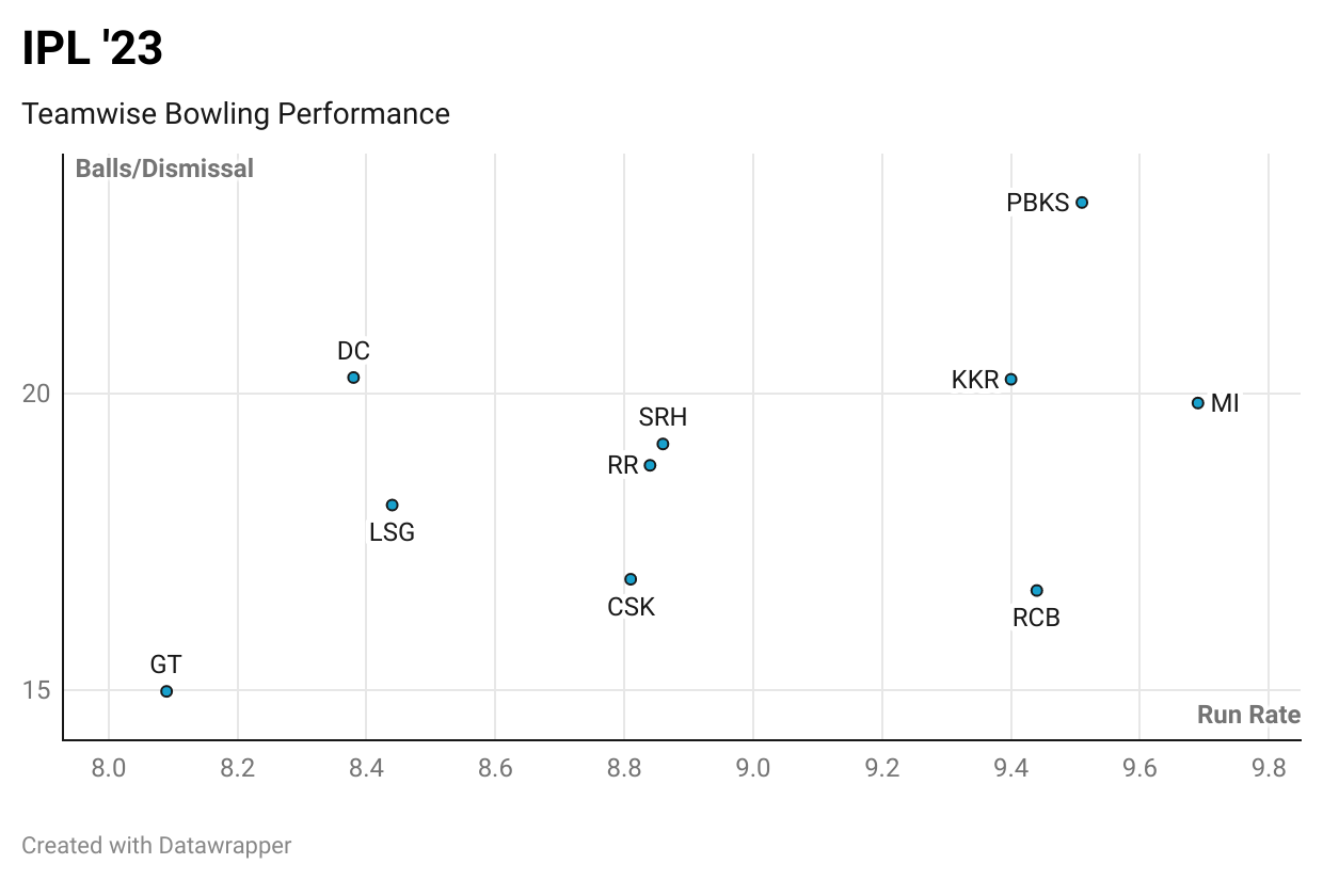In the middle-overs, MI have been the best batting unit. They have scored the most runs. They have done this by scoring the fastest amongst all teams (9.3) and second-best balls/dismissal (22.0). A lot of it has to do with Suryakumar Yadav’s performance in this phase. He tops the charts for runs, strike-rate, balls/boundary, etc. amongst others. On the other hand, Gujarat’s bowling attack has been one of the better bowling units in overs 7-15. This will be a key matchup for both teams.