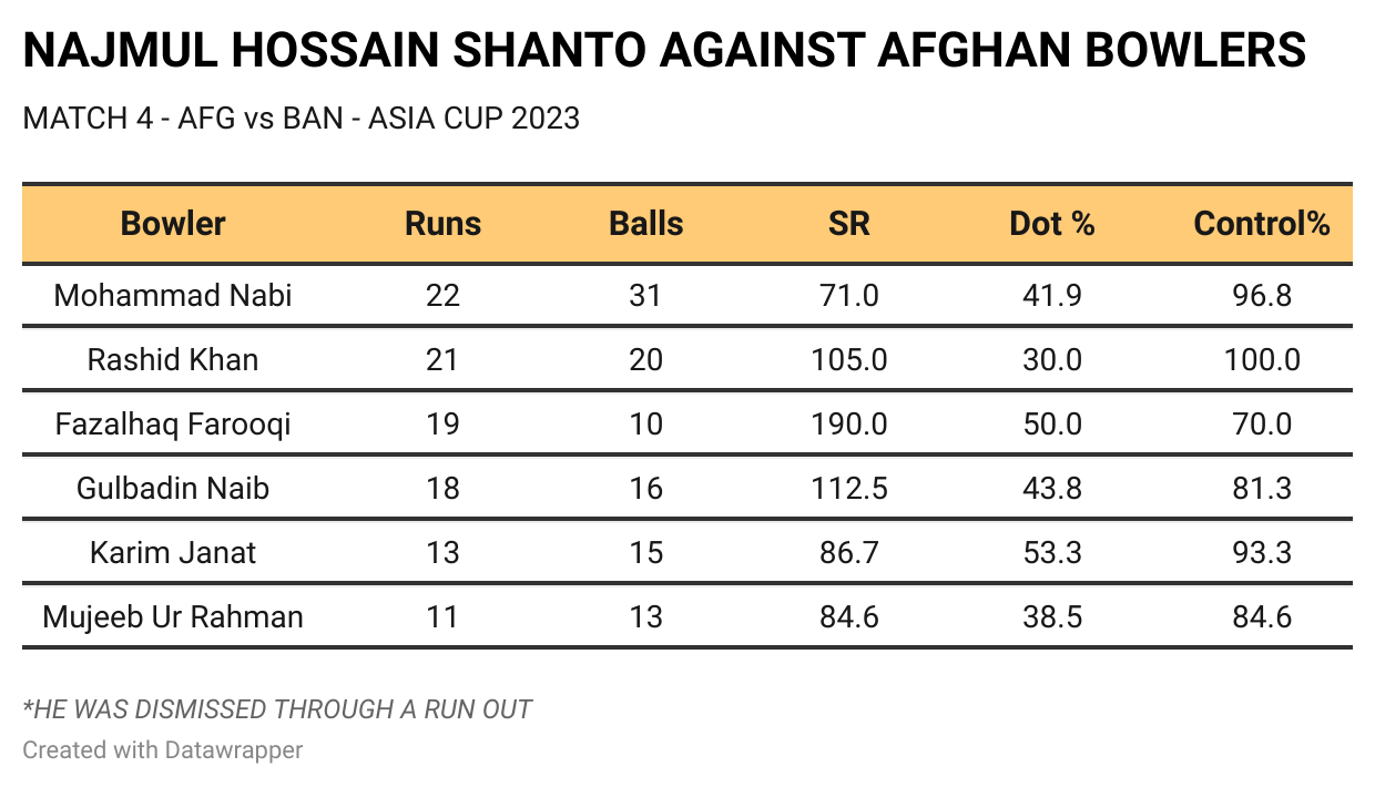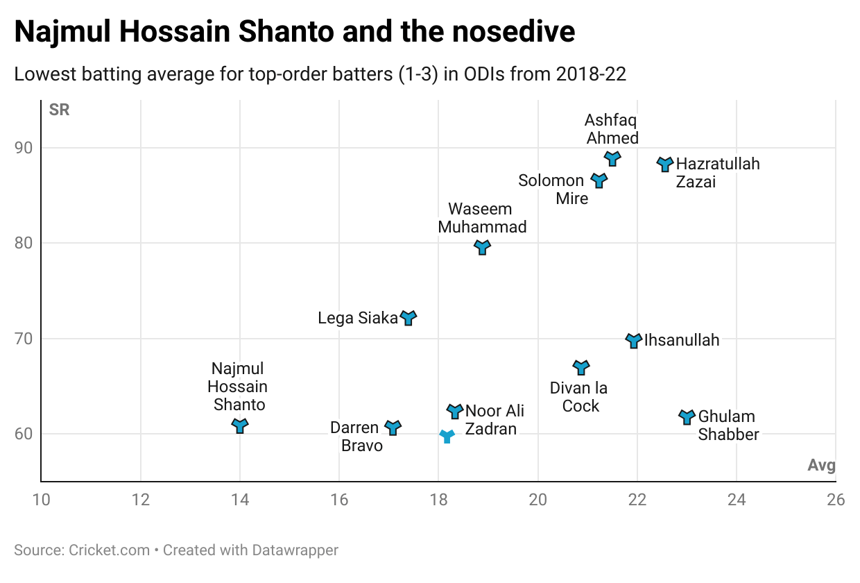 But Najmul absolutely tanked. Across 15 ODIs, he averaged 14, his strike rate read 60.9. Forget that, he had only scored 24 boundaries in his ODI career by then. Wait, hang on. That’s only part of the embarrassment.