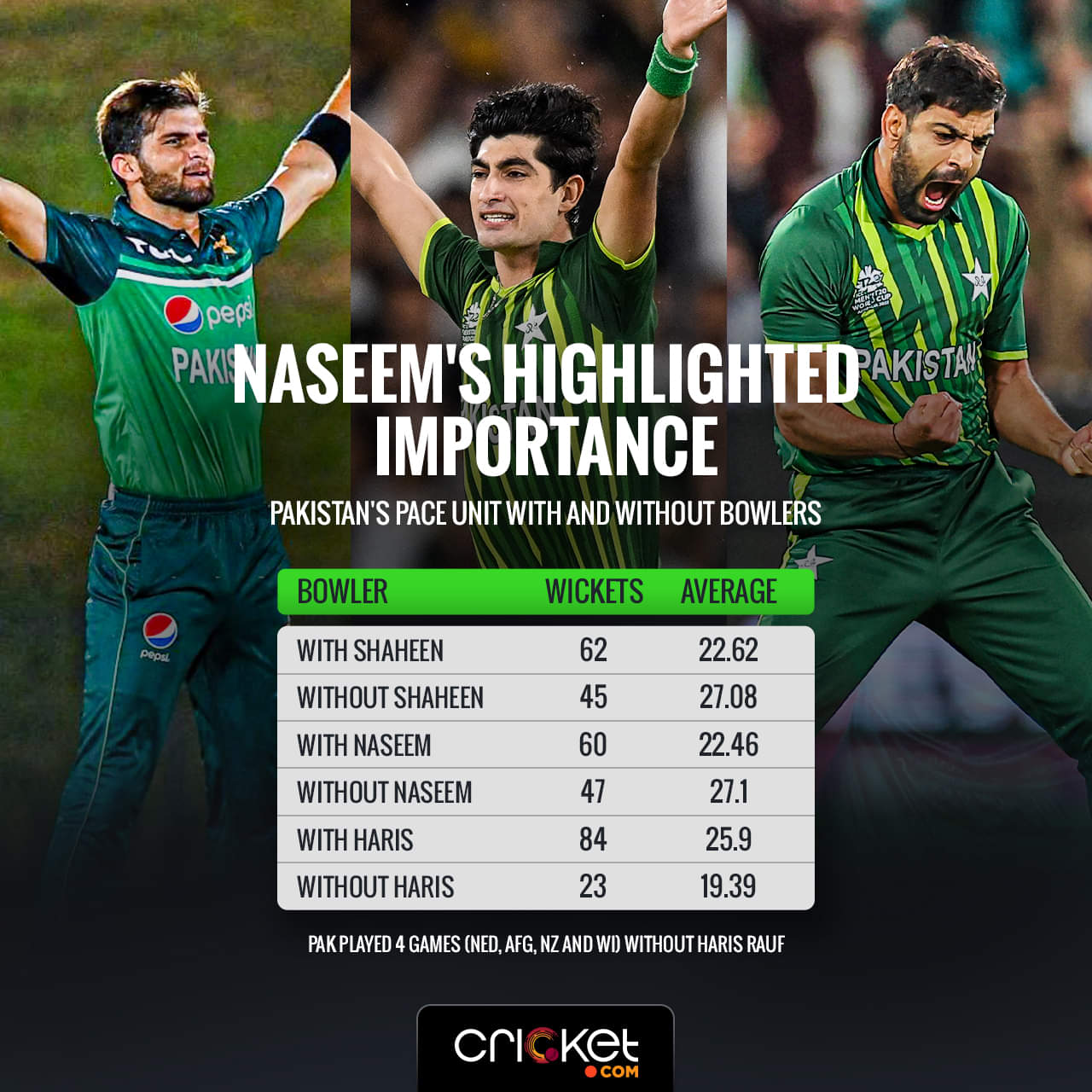 When you dig deeper, whenever the right-arm pacer has missed a game since making his debut, the Men in Green’s pace unit has averaged 27.10, which is almost a five-run jump, with the strike-rate reading 30. That essentially means that Naseem has only made the bowling unit more lethal.