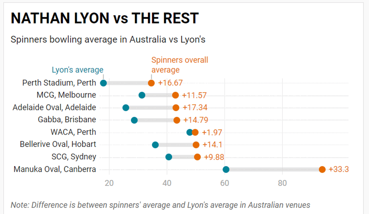 Barring WACA, the difference between Lyon’s average and the overall spinner’s average is massive, further proving why he is one of the best spinners Australia has ever produced.