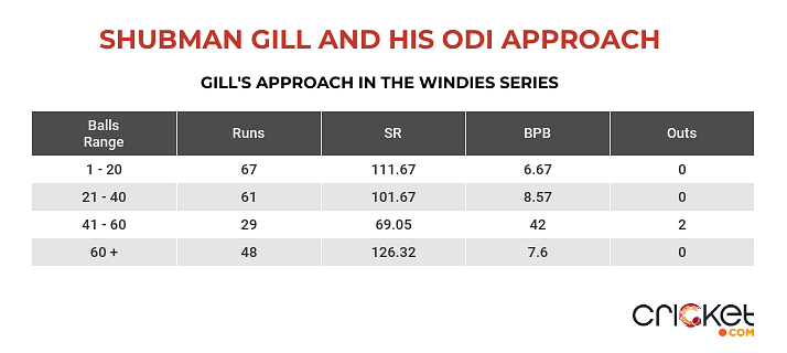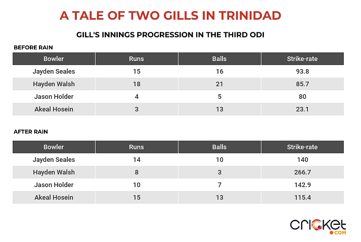 In his first 20 balls this series, Gill has struck at 111.67, scoring a boundary every 6.67 deliveries, making the fullest use of the powerplay. Today, he played the different game. In a clash that was constantly threatened by the weather, Gill returned in a different avatar after the first rain-break.