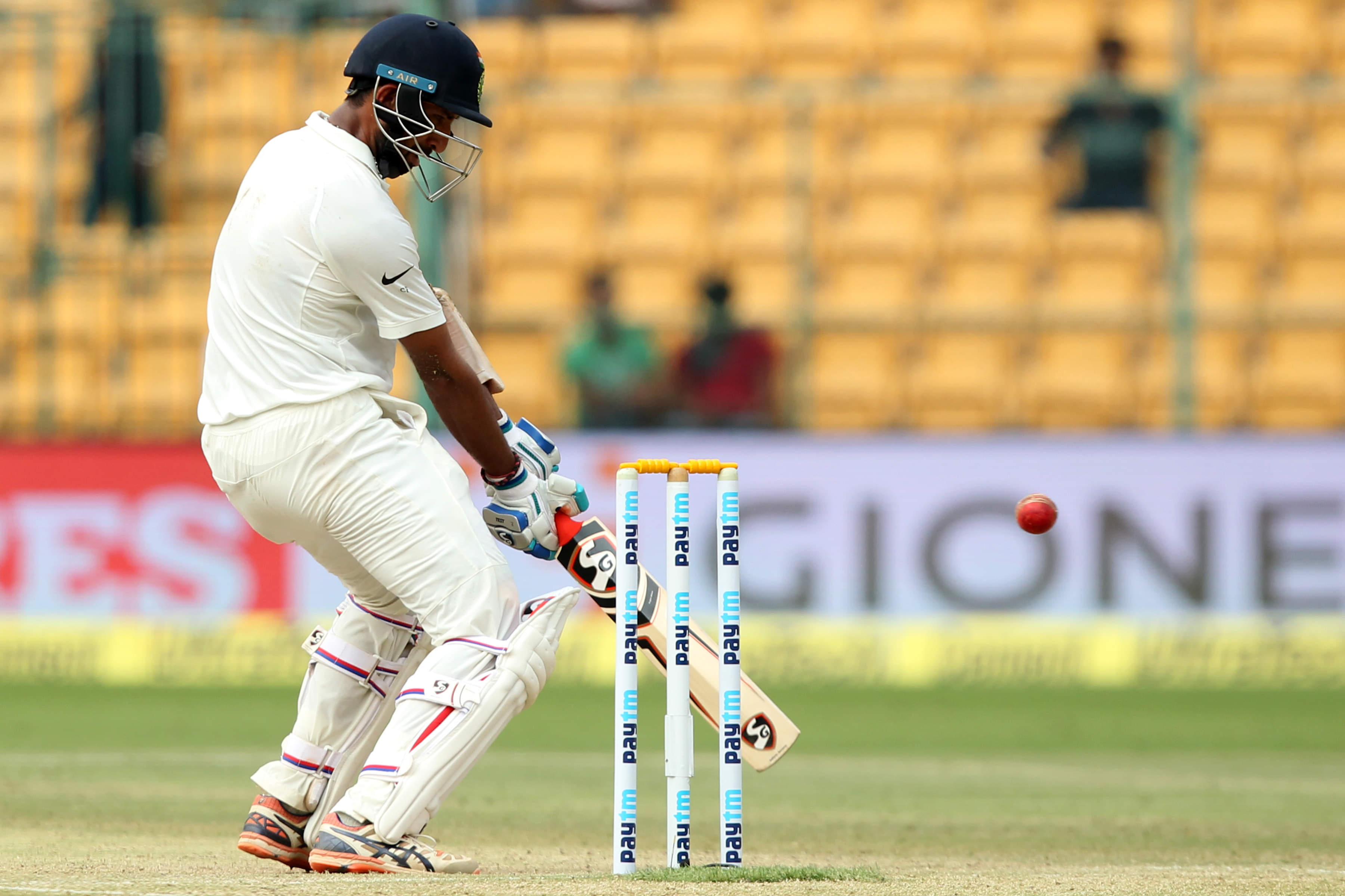 The best, most skillful batting, occurs in testing circumstances. Pujara was severely tested by the first ball he faced. But the bounce that helped defeat Rahul saved him when the ball vaulted his stumps as he allowed it to pass by untouched. The exaggerated seam movement and steep bounce made driving on the up, for instance, a hazardous exercise, as Shikar Dhawan soon found out when his expansive drive to Lakmal crashed into his stumps via his inside edge.