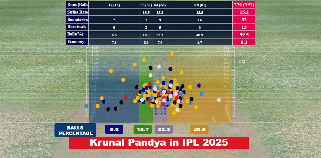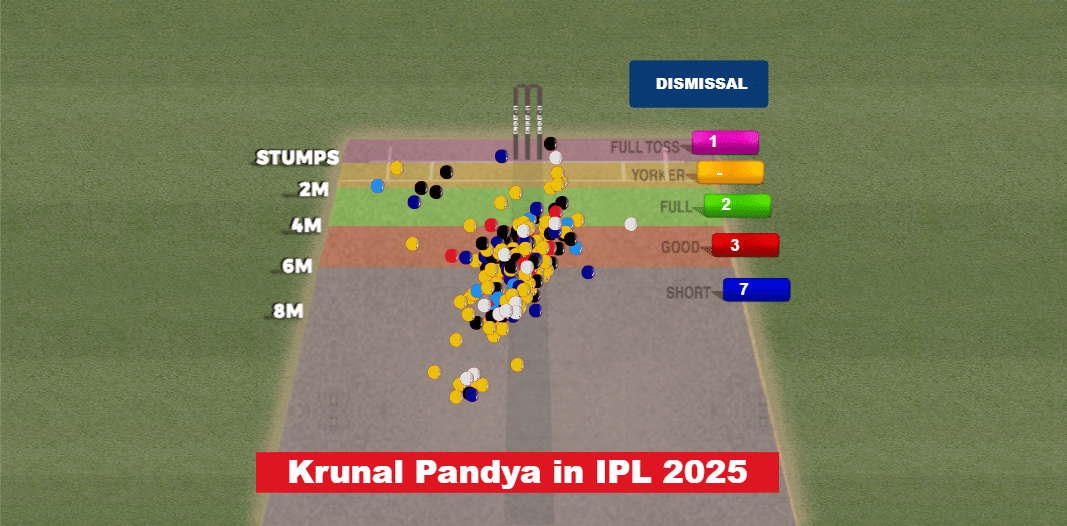 Krunal has bowled over 33% of his deliveries on the wickets, indicating his attacking mindset.