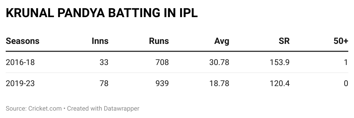 Before this game, Krunal had walked in inside the powerplay on 16 occasions in the IPL, and out of those, his side had tasted victory just four times. Safe to say, if Krunal came out to bat in the powerplay, more often than not, the team's chances of victory would deplete considerably.