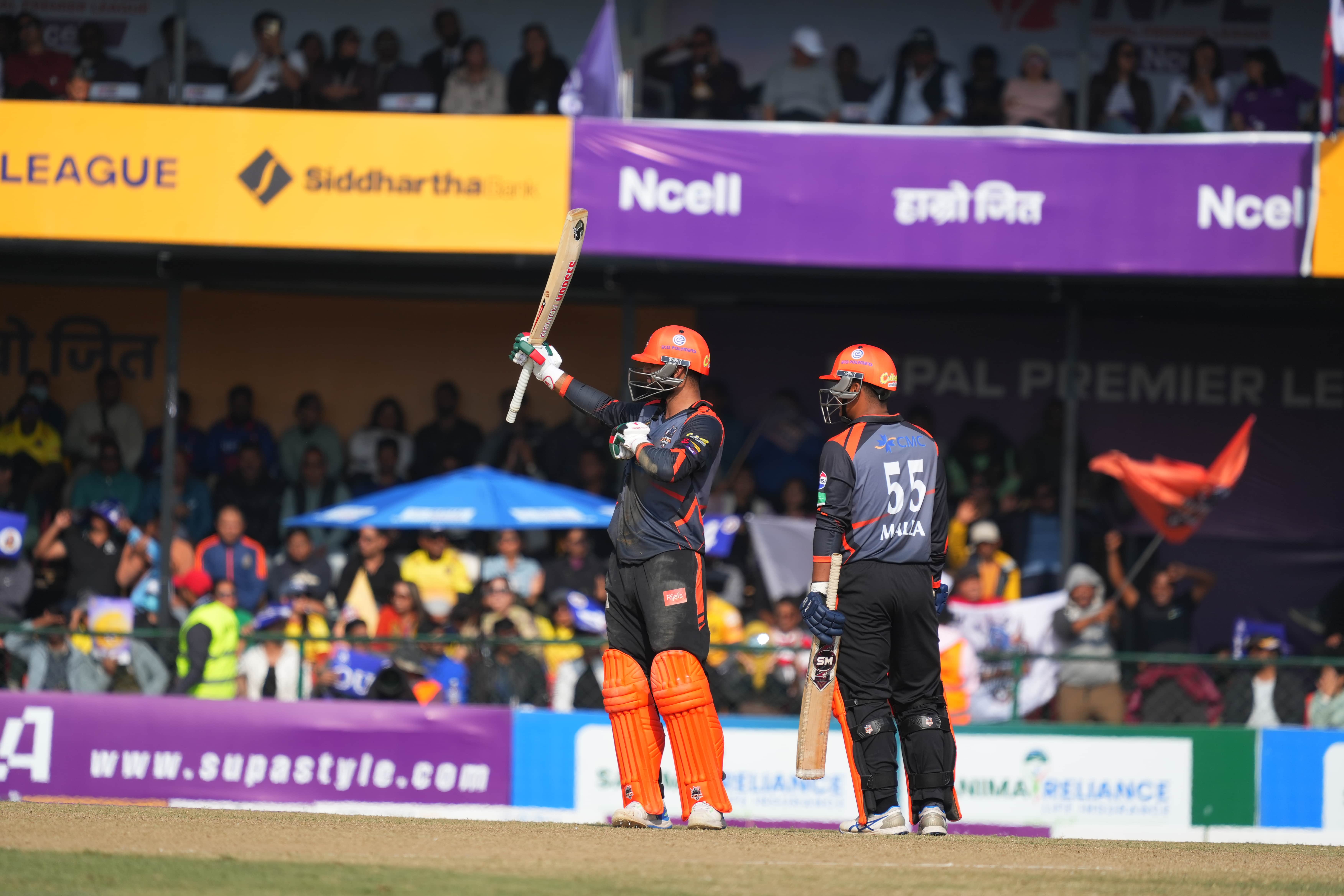 While he started slow, taking his time against the bowlers, with eight off 12 deliveries, he took on Dipendra Singh Airee, Naren Saud, and Saif Zaib during the middle overs, which accelerated the Rhinos' run-scoring.