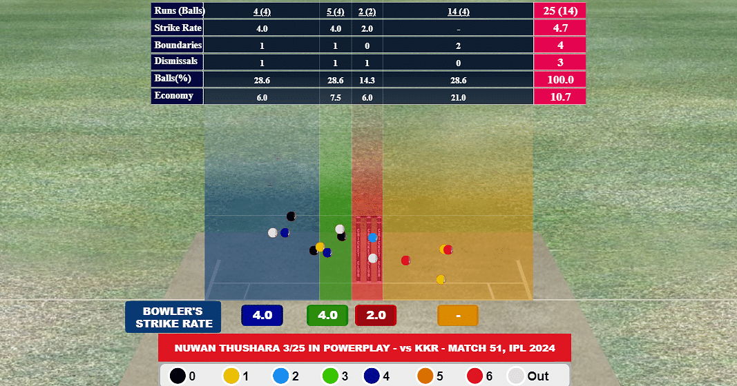 On a two-paced wicket, Thushara drew 41.7% false shots in the powerplay alone. He made Salt, Raghuvanshi, and Shreyas Iyer play the ball too early. Even when he bowled only two balls in line with the stumps, Thushara’s pace, ranging between 130 and 140 kph, was perfect to dismantle KKR at the top.