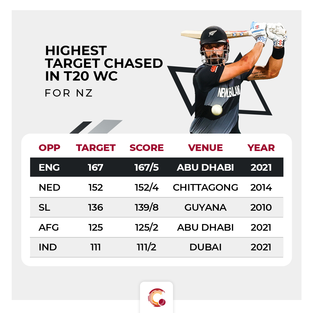 An unbeaten 72 off 47 deliveries studded with four boundaries and four massive hits over the fence propelled New Zealand to a five-wicket win after chasing 167 runs for the loss of five wickets. The Kiwis have been one of the most consistent sides at the international level and produced an all-around performance to get over the line against a formidable England outfit by a comprehensive margin and sealed their place in the summit clash of the competition. The target of 167 runs was also the highest successful target chased by the Black Caps in the T20 World Cup. 152/4 against the Netherlands in Chittagong in 2014 is second on the list.