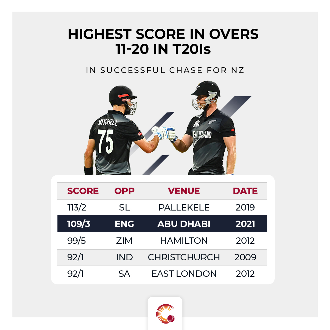After losing two of their most experienced players Guptill and Williamson, in the powerplay, the Black Caps scored at an economy rate of 5.8 runs per over and crawled their way to 58/2 in 10 overs. Despite a slow start, the middle order of the side unleashed strokes all around the ground and smashed 109 runs in the second half, which is the second-highest score in overs 11-20 for New Zealand in a successful run chase in T20Is. They had scored 113/2 against Sri Lanka in 2019 at Pallekele, which is the highest for them in this phase.