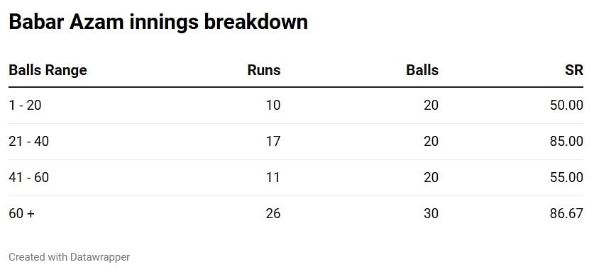 By profile, Babar is not a ‘powerplay basher’ and that’s a fact. Yet that can be no excuse for batting at a strike rate of 44.4 against the brand new ball with the field up, chasing 321 no less. Particularly when a batter of a similar profile - Will Young - scored 32 off 34 balls at a strike rate of 94.1 earlier in the day, batting in arguably slower conditions.