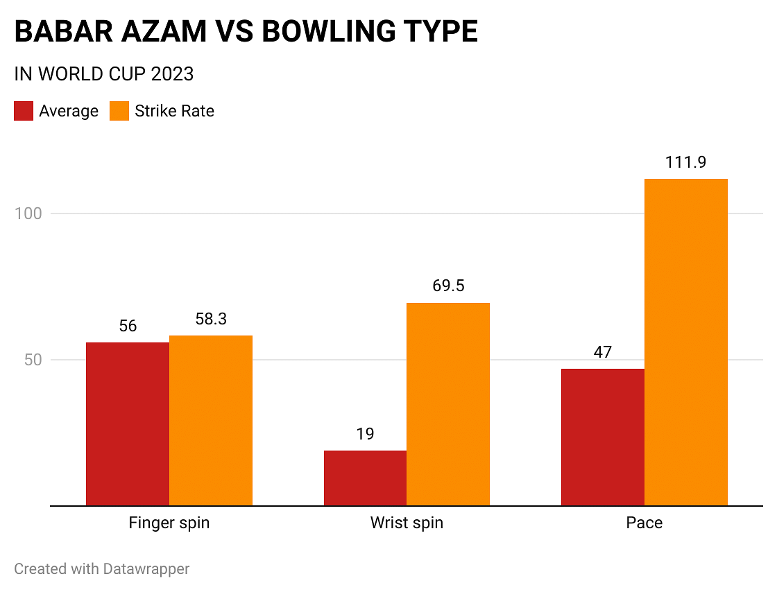 He has struggled against spin, averaging only 28.3 (four dismissals) at a pedestrian strike rate of 63.5. Against finger spinners, he has failed to rotate strike while the wrist spinners have caused his undoing. Babar didn’t play any left-arm wrist-spin during his blooming period (aforementioned 20 months). In another facet of playing multi-team tournaments, he has faced three such bowlers - Kuldeep Yadav, Noor Ahmad, and Tabraiz Shamsi. Two of them have sent him packing.