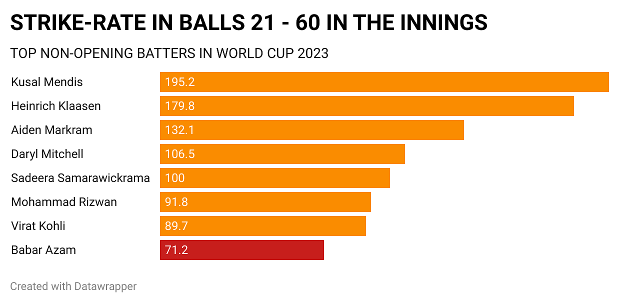 The right-hander has a strike rate of 84.1 in the first 20 balls of his innings. However, it drops to 71.1 over the course of the next 40 deliveries. At a stage where other batters pick up, Babar is going into the snooze mode for a period of 40 balls. And even post that phase, he has a strike rate of only 89.2.