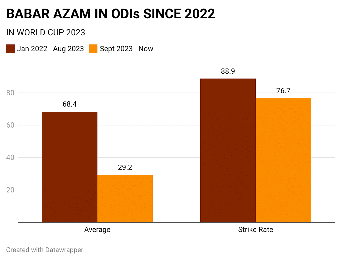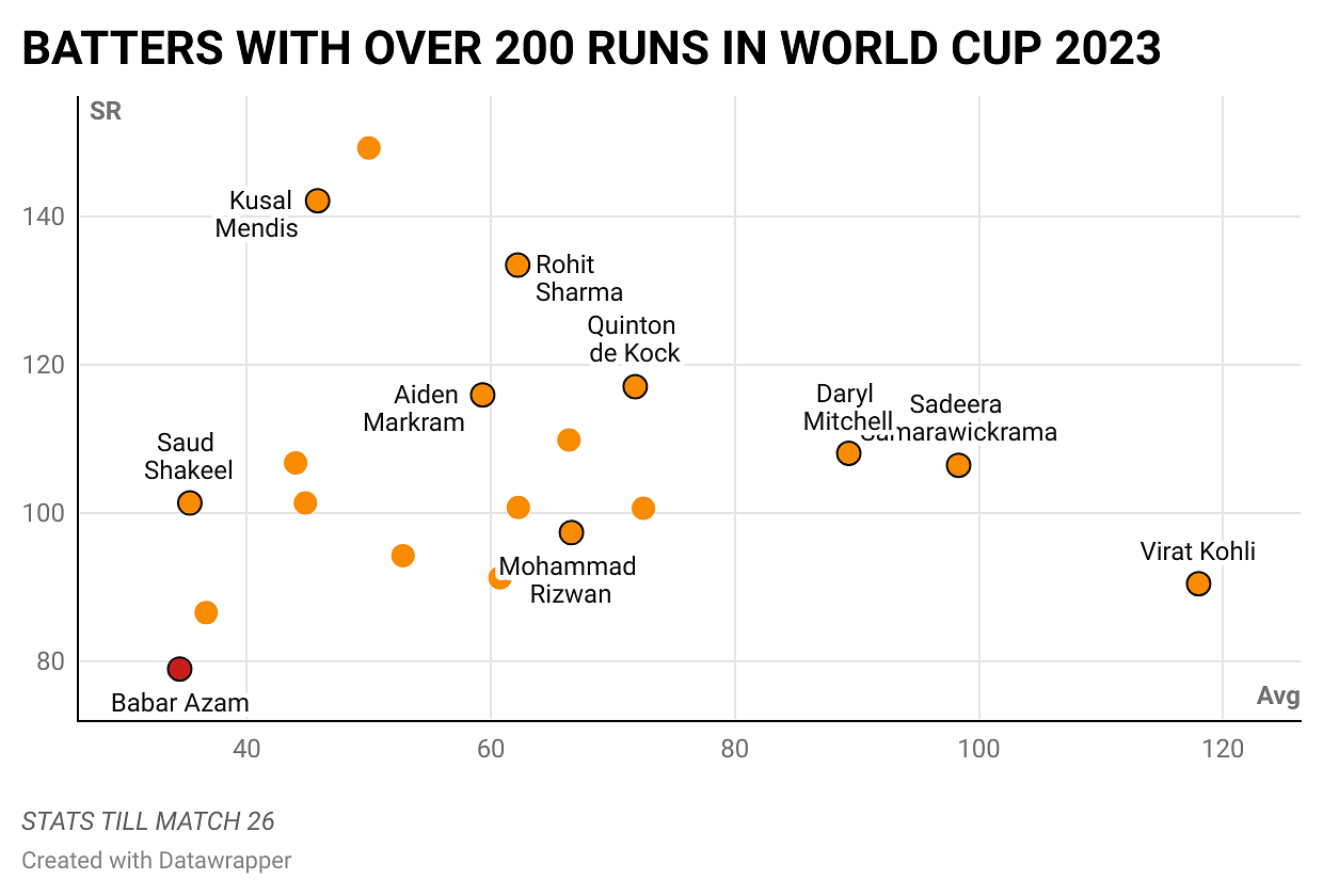 Heading into the World Cup as the number one ranked ODI batter, many predicted Babar to be the highest run-scorer of the tournament. On the contrary, he has managed only 207 runs, averaging 34.5 at a strike rate of 79. He has both the lowest average and strike rate among the 19 batters to have scored over 200 runs in the competition.