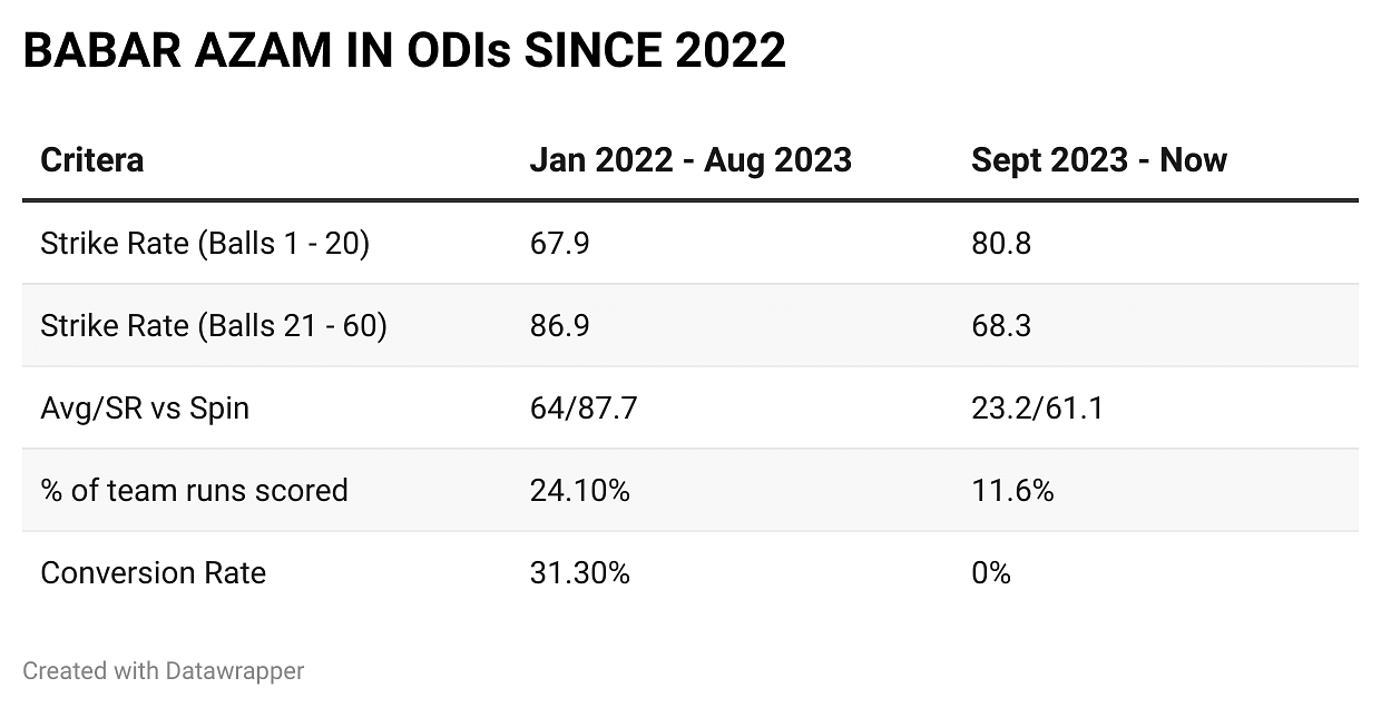 There was already an asterisk to his growing reputation as an ODI batter. Most of his runs had come in Pakistan. In 20 months between January 2022 and August 2023, Pakistan played 15 of their 21 ODIs in rigid batting-friendly conditions at home. The other three ODIs were against the Netherlands and another three against Afghanistan in Sri Lanka. The 29-year old averaged 68.4 at a strike rate of 88.9, including five hundreds and 11 fifties. He scored nearly 25% of his team’s runs. The streak ended with 151 against Nepal during the Asia Cup in Multan.