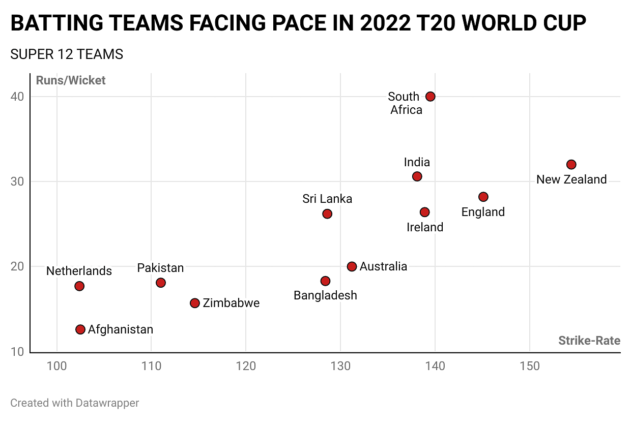 It is no surprise that Pakistan have struggled to cope with the pace and bounce in Australia. Their batting average of 18.1 against pace is only better than that of Afghanistan and Netherlands among the Super 12 sides. Talk about strike-rate, they dwindle on that aspect too.