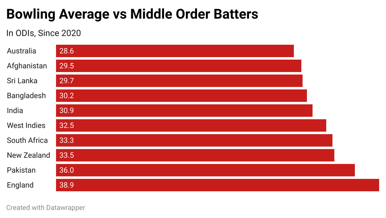 Along with England and New Zealand, they are the only teams to average less than 1.4 wickets per match in the middle overs (11 - 40) in the last three years. And if you take into account that they have played over 70% of their games in spin-friendly conditions of the Asian continent, you begin to realize why this problem could prove to be cause for concern during the World Cup.