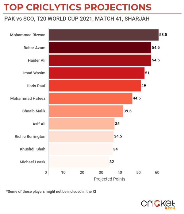 FANTASYPakistan will take on Scotland in Match 41 of the T20 World Cup 2021 at Sharjah on Sunday (November 7). On an unbeaten run, Pakistan are through to the semis and must be aiming at bolstering their confidence further since there seems to be no chinks to be fixed in their armour. Scotland, on the contrary, would like to get off the mark in the Super 12 stage before bowing out of the tournament.