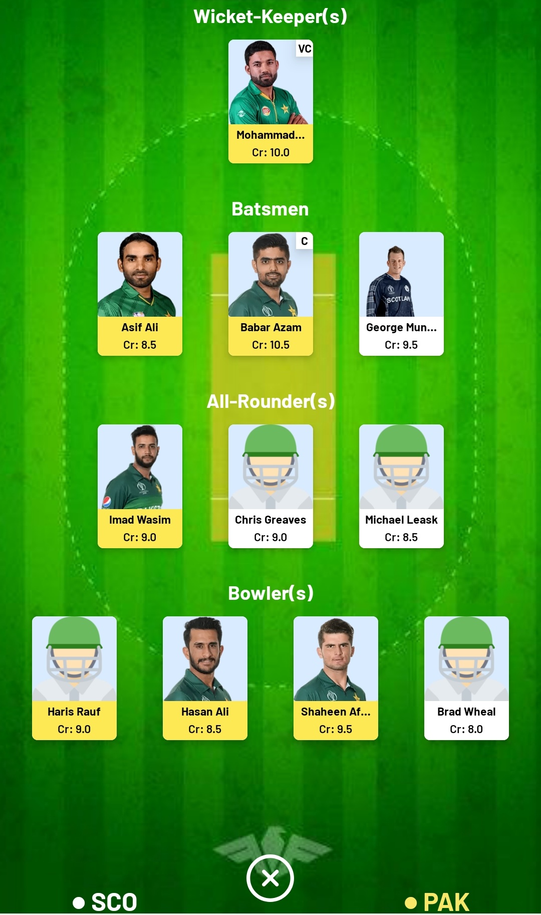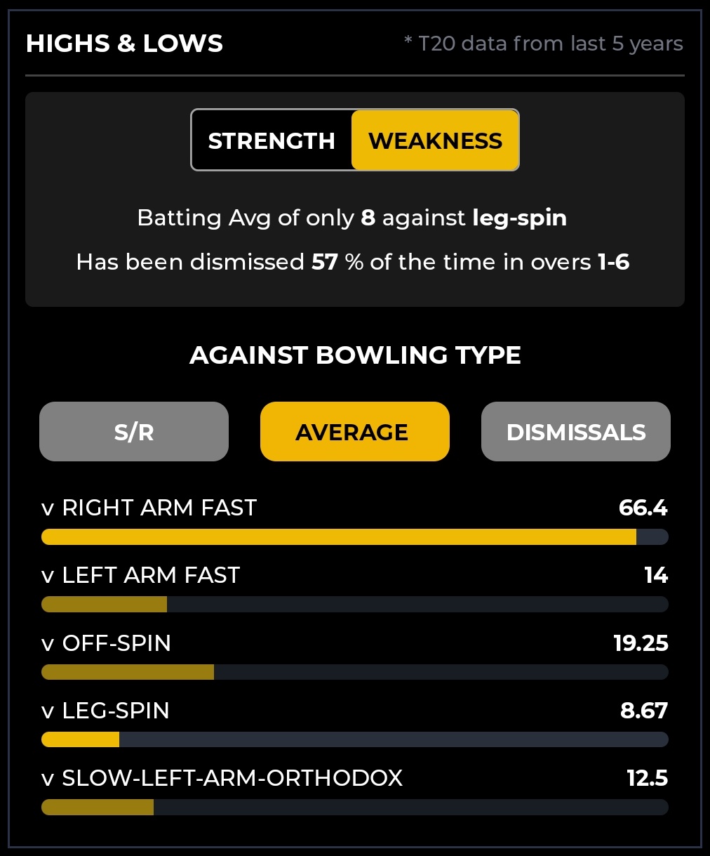 The above picture depicts George Munsey’s batting average against various bowling types. There lies a clear challenge for him first up against Shaheen Shah Afridi and Mohammad Hafeez, the two potential new ball bowlers for Pakistan in this contest. Munsey has still made it to our suggested team given he is the highest run-scorer for Scotland in this tournament but there lies a clearly match-up for him to counter.
