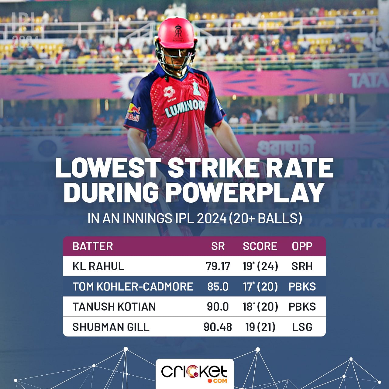 Opting to bat first, Rajasthan Royals (RR) couldn’t gather any momentum in their innings. Sam Curran dismissed Yashasvi Jaiswal in the first over. Tom Kohler-Cadmore, making his IPL debut, scored only 18 off 23. Scoring 17 off 20 balls in the powerplay, he played the second-slowest powerplay innings in the season. After eight overs, RR were only 43/3.