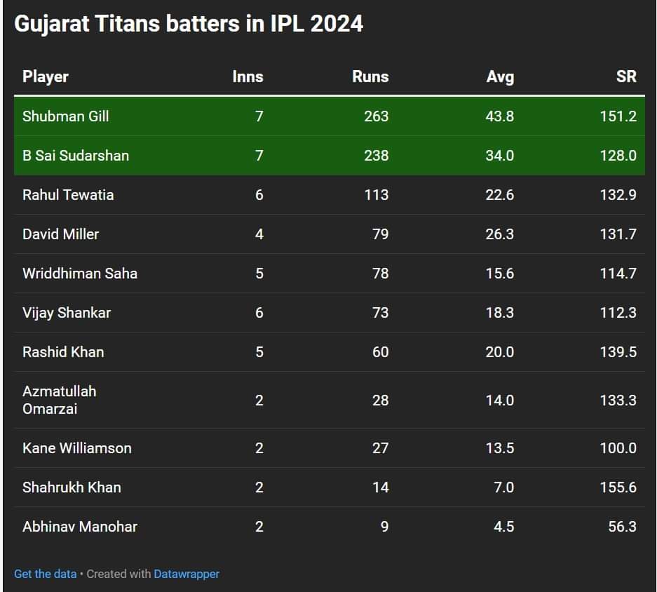 So far this season, Gujarat Titans have scored 1025 runs with the bat. Out of that, a whopping 501 runs have come from the bat of Shubman Gill and Sai Sudharsan, who have carried the team’s batting on their back. For GT, barring Gill (44) and Sudharsan (34), no other batter has averaged more than 26.