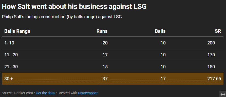 In the first 30 balls, he scored 52 before accelerating to score 37 off the next 17 balls, scoring at 217.65. 74 of the 89 runs he scored were through boundaries. His partnership with Iyer (120 off 76) helped KKR to an easy win.