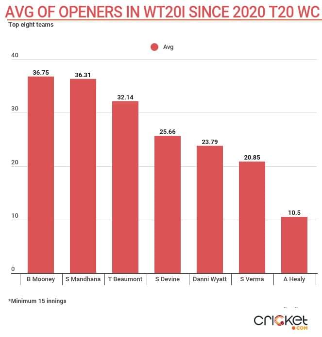 There ain't any doubt that, along with Mandhana, she forms one of the most destructive opening pairs in the shortest format. However, the same has not been translated into performances as she scored 438 runs in 21 innings since the last mega event at an average of 20.85, which is the second-lowest among openers from the top eight nations with a minimum of 15 innings.