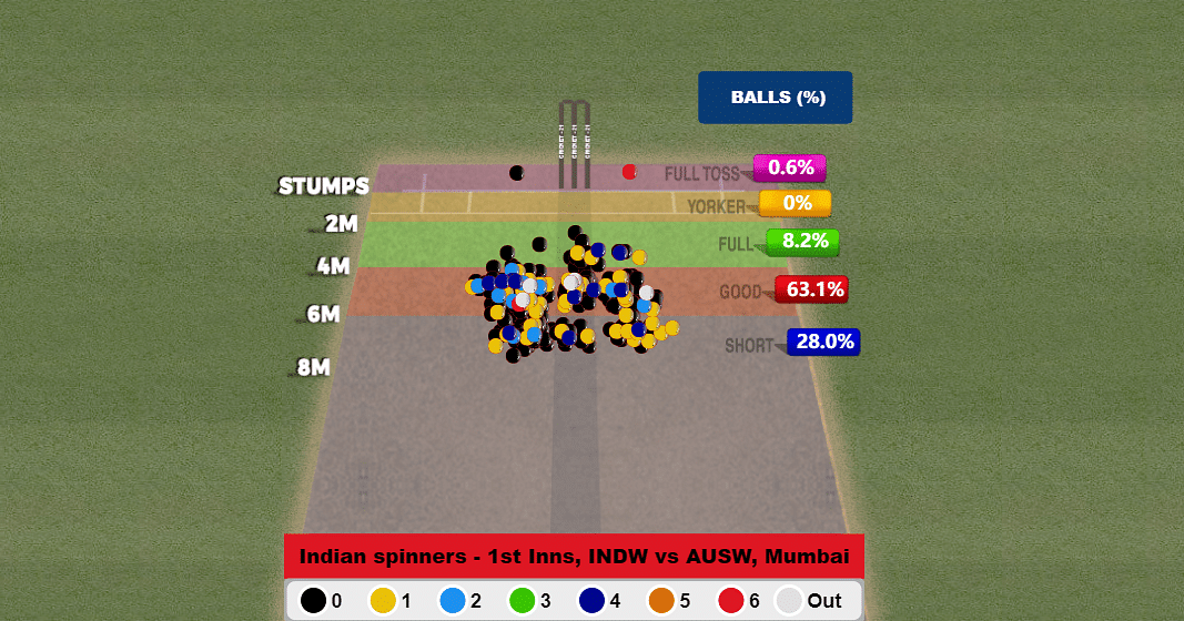 The other Indian spinners, Deepti Sharma and Rajeshwari Gayakwad, also bowled slow in the air, largely in the low 70s, flighting the ball and giving at all the time to turn. The ball did turn and also kept low occasionally, resulting in Alyssa Healy’s wicket. Their accuracy also allowed India to create run-rate pressure, as the Australian batters (except McGrath and Healy) failed to counterattack and plummeted in the third session of the day.