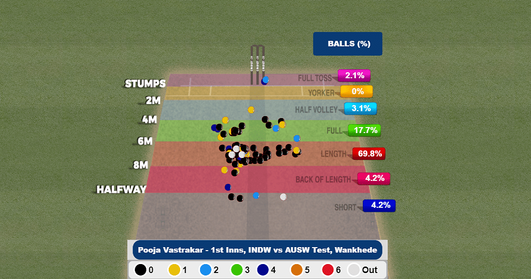 Throughout the innings, Vastrakar’s consistency on the good length proved extremely crucial as this was also the area from where she was generating seam movement both ways, making it hard for the batters to play their shots. Her economy rate of 2.2 on that length is proof of that.