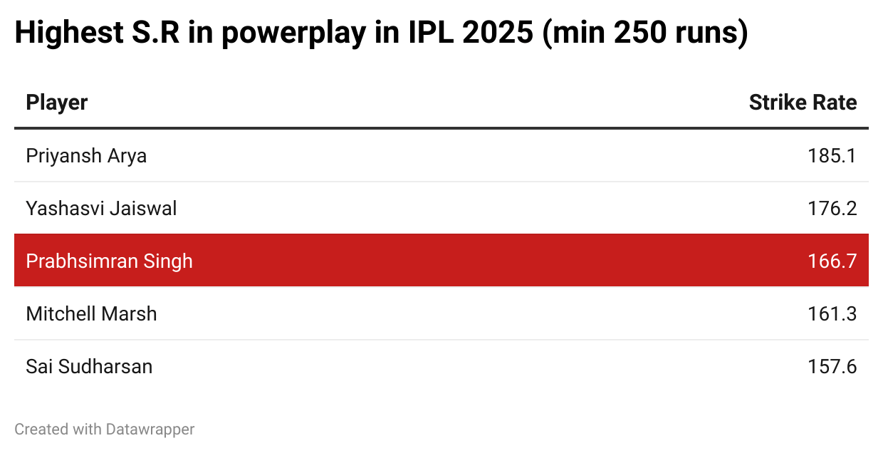 Cut to IPL 2025, Prabhsimran has turned into an even more 'aggressive' powerplay basher. With 280 runs, he’s the third-highest run getter in the powerplay in this edition. Among batters with 250+ runs in the powerplay, his strike rate of 166.7 is bettered by only two other batters — Priyansh Arya, his opening partner, and Yashasvi Jaiswal.